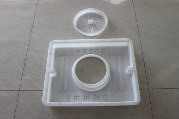 此水泥方井蓋模具采用聚丙烯樹(shù)脂經(jīng)注塑加工而成,模具兩端以小開(kāi)口設(shè)計(jì),以方便后期檢查時(shí)的位置移動(dòng)。在方井蓋模具的表面加以防滑條及供水部門(mén)專屬字樣,即“節(jié)約用水”和“城市自來(lái)水”標(biāo)志。而在方井蓋模具的中間設(shè)立一個(gè)小型的圓孔蓋座,為日后水廠對(duì)于自來(lái)水管的檢查工作帶來(lái)更大便利。