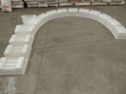 其中部件A基座型拱形骨架護(hù)坡模具左右對(duì)稱,具體數(shù)量可以根據(jù)護(hù)坡實(shí)際高低需求來(lái)進(jìn)行水泥護(hù)坡磚的預(yù)制,一般高低為三個(gè)數(shù)量,左右共6個(gè)。部件B為拱形骨架護(hù)坡模具拱形部分,單拱鋪設(shè)共需10塊,部件C主要用于部件B和D接縫固定,可以更加有效的確保拱形骨架護(hù)坡的安全性,防止水泥護(hù)坡磚整體偏移及散架。