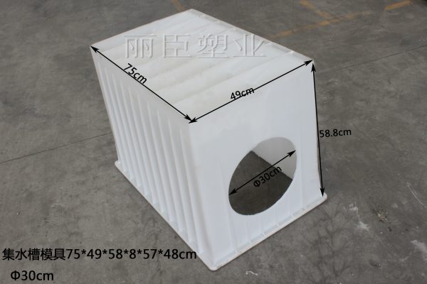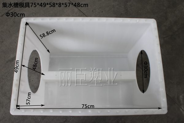 此款產(chǎn)品為客戶(hù)定制水泥集水槽模具,使用全新聚丙烯塑料原料,其中集水槽模具長(zhǎng)度為75厘米,寬度為49厘米,深度積水區(qū)高度為57厘米,稍淺積水區(qū)為58.8厘米,實(shí)際高度深淺主要取決于預(yù)制水泥集水槽成品,具體詳細(xì)尺寸可參考下圖: