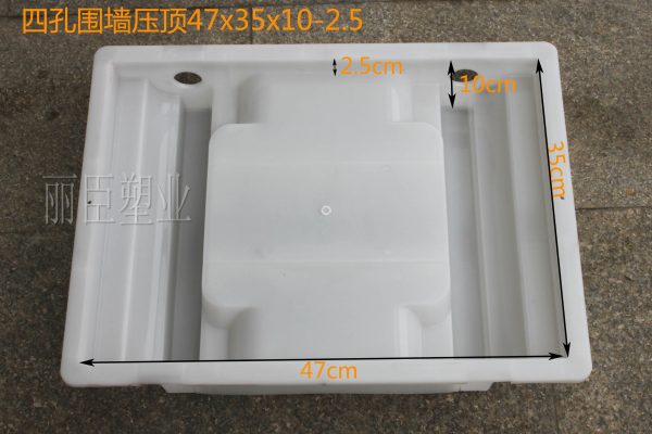 圍墻四孔壓頂模具在注塑用料上采用聚丙烯塑料為主要生產原料,其模具的尺寸為47x35x10-2.5,毛面主要以長方形為主,對模具進行脫模過程中,脫模夾的使用要求不高,且壓頂模具的性能優越獲得了廣大用戶的追捧。