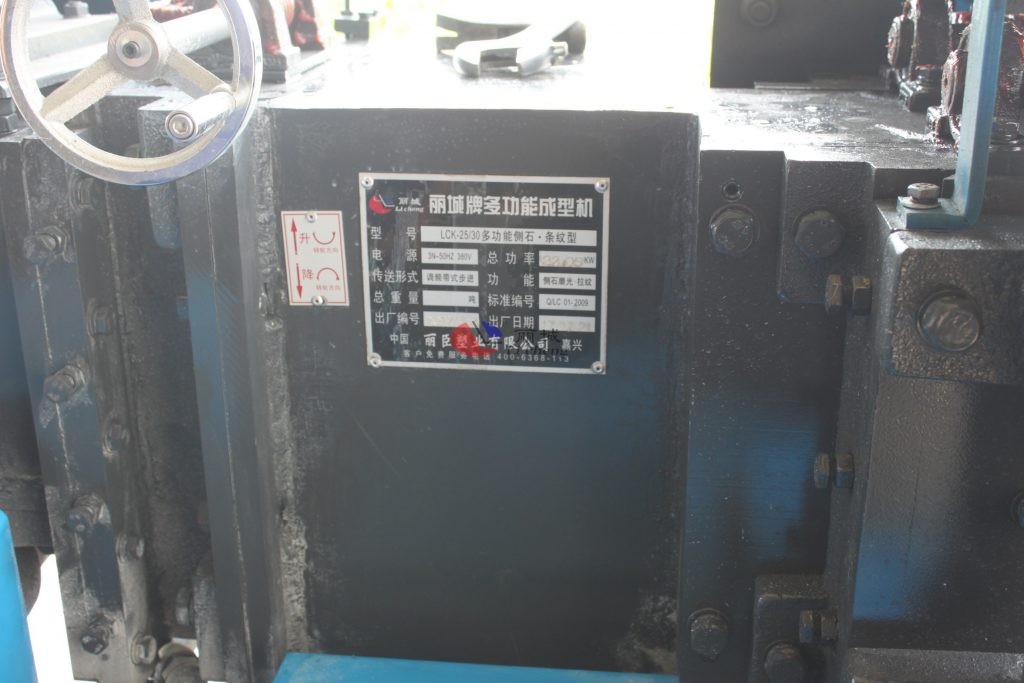 這款LCK-25/30多功能側石二工位條紋成型機,其主要功能是對澆筑成型的水泥模具進行二次加工成型,其機器總功率為22.05KW,其傳送形式為調頻帶式步進,電源使用的標準為3N-50HZ 380V。