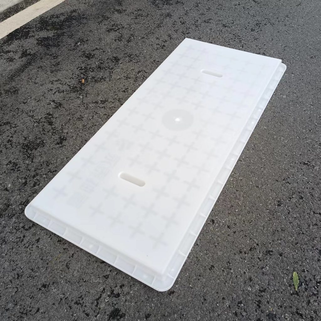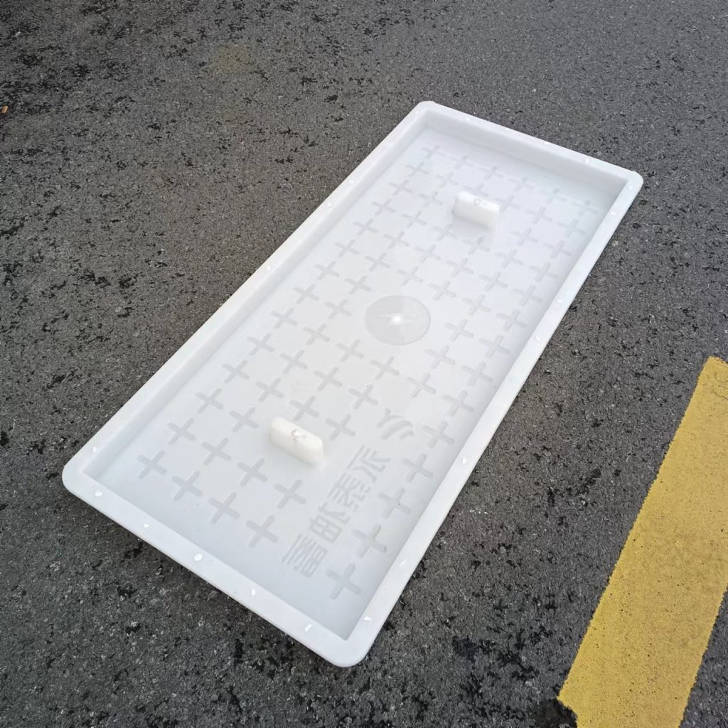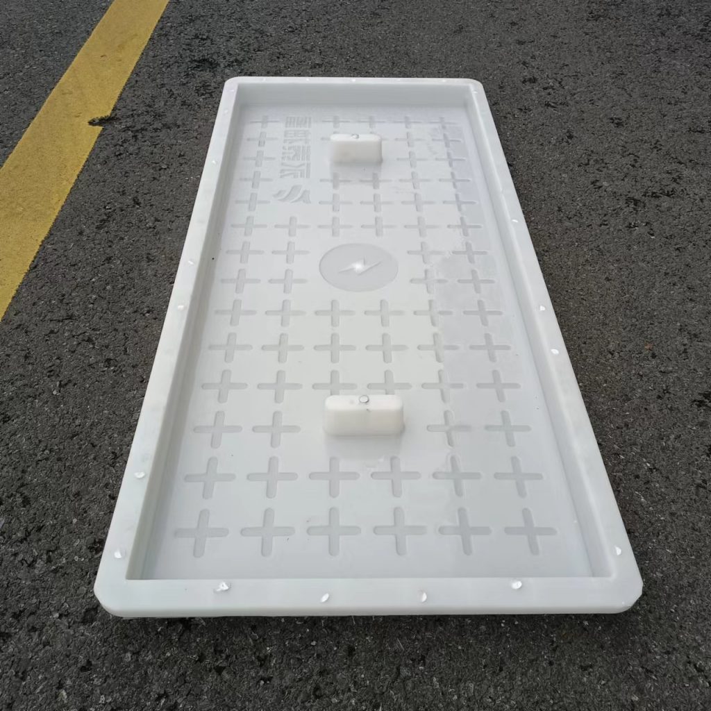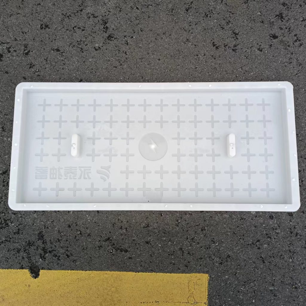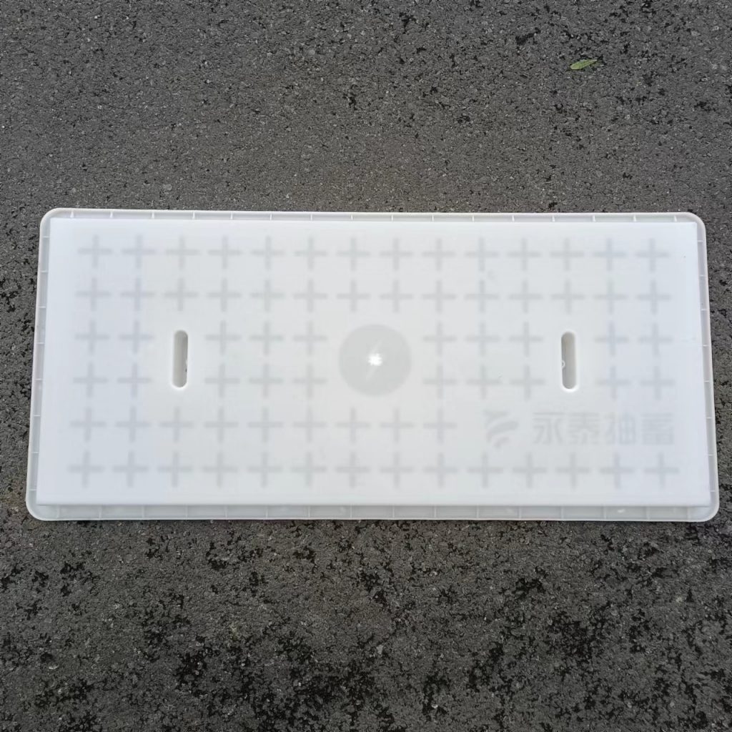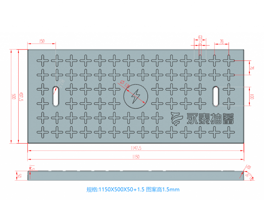 產(chǎn)品為米白色pp材質(zhì)制成,版面帶十字花紋,中心帶有電力標(biāo)志,兩側(cè)帶二孔,方便提拉,右下角帶有“永泰抽蓄”四字,為客戶定制產(chǎn)品,模具尺寸還有90cm長(zhǎng)度,里面花紋基本一至,預(yù)制成型后電力蓋板。