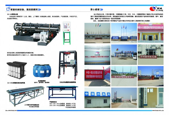 麗臣塑業主營產品:現澆塑料模板,六角護坡模具、高鐵水泥護欄模具、溝蓋板模具、路沿石模具、彩磚模具、井蓋模具等一系列水泥制品塑料、鋼模具及配套的機械設備配件等,如條紋磚條紋機、脫模機、高鐵護欄離心機、加料機等。
